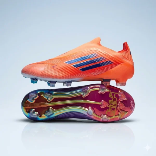 التفاصيل الفاخرة، خاصة النعل اللامع بتأثير قوس قزح، تعطيك مظهر استثنائي يخليك تبرز في كل مباراة، أما اللون البرتقالي القوي فيعكس شخصية لاعب هجومي واثق.